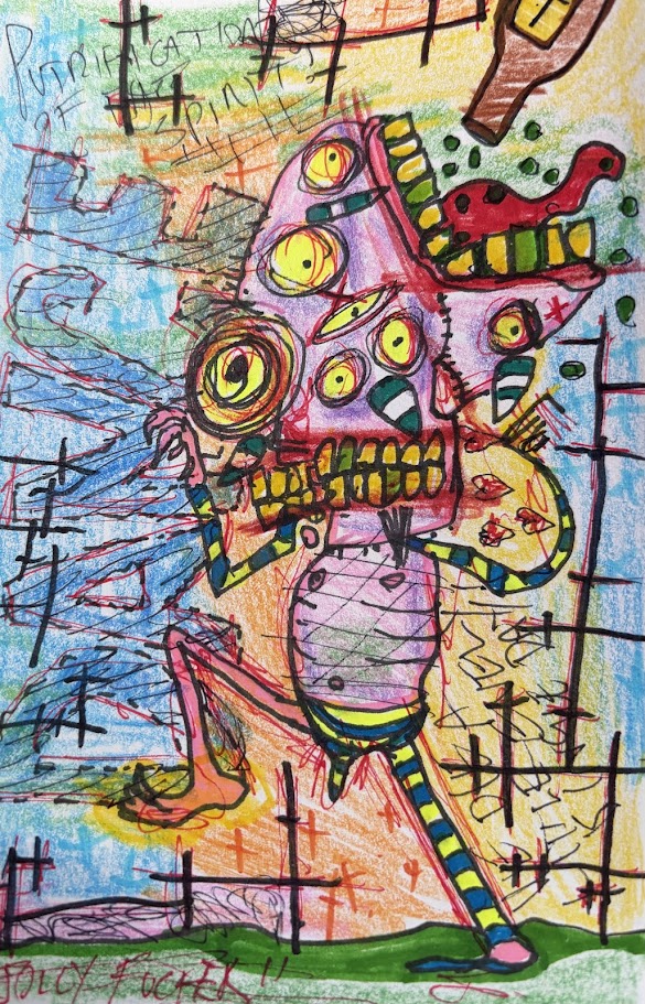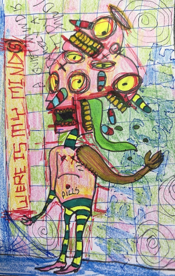 Pages punctured, torn and replaced, screaming scrawled texts,